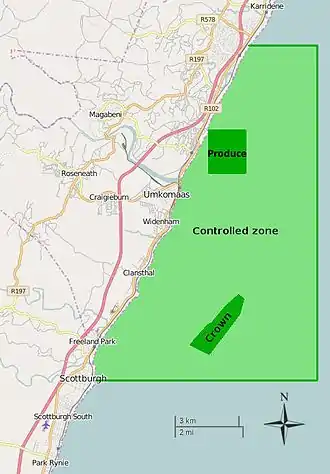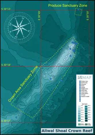 The Aliwal Shoal Marine Protected Area (MPA) was proclaimed in 2004 in terms of section 77 of the Marine Living Resources Act of 1998, managed by Ezemvelo KZN Wildlife. It extends 18 km along the coast from the mouth of the Mkomazi River at 30°11.92'S; 030°48.29'E to the mouth of the Mzimayi River at 30°20.80'S; 030°43.60'E south of Scottburgh and with a width of some 5-12 km into the sea. It comprises a control zone in which limited fishing is allowed and two restricted zones where no fishing is allowed. The Crown area restricted zone, delimited the 25 m isobath around the crown, includes about 2.5 km2. The Produce restricted zone includes the wreck of the MV Produce at around 30 m. The rest of the MPA is the control zone. The MPA was expanded in 2019, but this is not expected to affect diving.