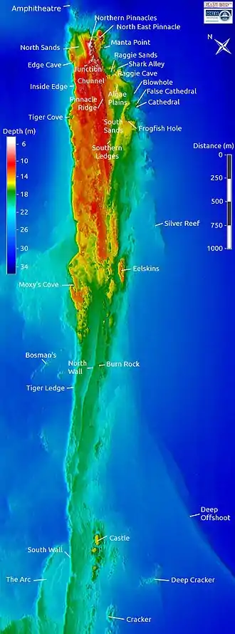 The Aliwal Shoal is a fossilised sand dune lying roughly parallel to the coast, about 5 km from the shore. It comprises a narrow northern part (the crown, some 250 m wide, becoming about 800 m wide and finally with a wider landward ridge to the south, greater than 2 km in width. The crown varies in depth from about 6 m (around the Northern Pinnacles) to around 30 m on the seaward side. The mean depth of the crown area is 12.5 m. The southern wider area includes several protrusions that reach from a depth of some 30 m to around 15 m (e.g. Howard's Castle, Landers Reef). In the crown area, many dive sites, e.g. Raggie Cave and Chunnel have a large amount of uneven topography with small caves, ledges and swimthroughs rich in sea life, both fish-wise as well as in invertebrates, e.g. octopus.