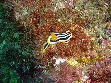 Various fish and invertebrates can be seen: Starry moray, Strepie, Round ribbontail ray, Blackedged blaasop, White spot butterfly fish, Twotone fingerfin, Black edged butterfly fish, Shortspine porcupine fish, Honeycomb moray, Salt and pepper moray, Goldbar wrasse, Bridle triggerfish, Spotted Hawkfish, Goldies, Potato bass, Crown squirrelfish, Whitespotted boxfish, Ladder wrasse. Queen coris. Yellow radial sea pen, Tubular hydroids, Yellow jelly colonial ascidian, White soft coral, Branched black coral, Barnacles, Mottled maroon sponge, Greentree coral, Nudibranch Chromodoris africana, Turret coral,