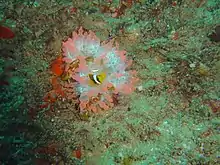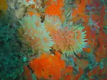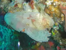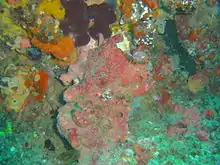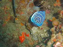 Wide variety of fish and reef invertebrates: Anemone fish, Two bar clownfish , Devil firefish, Emperor angelfish, Scorpionfish, Balloon porcupinefish, Longnose butterfly fish, Whitespotted butterfly fish, bluestreak cleaner wrasse, Spotted hawkfish, Dominoes, Yellowback fusilier, Spotted hogfish, Five lined cardinal fish, Paperfish, Honeycomb moray, Cave bass, Moorish Idols, Blue tangs, dark surgeonfish. Toby, Blacktip kingfish. Cushion stars and other stars, sea cucumbers, nudibranchs, shrimps, lobster, Thistle soft coral, Egg cowrie, yellow bowl sponge, Trumpet fish, zigzag oyster, Fleshy soft coral, giant anemone, Various sponges, Tube anemone with light blue tentacles, Greentree coral, Black feather stars, orange encrusting sponge, small purple, yellow and black colonial squirts, honeycomb coral, Small brown and yellow crabs, Warty off-white cucumber, brown star,