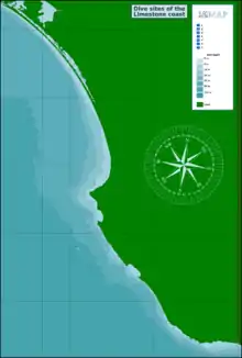 - Reef dive. Boat access only. Maximum depth 10m. Remains of an old shore line which consists of a series of naturally formed rock piles spread over a large area. The dive site consists of a series of naturally formed gutters in the seabed.