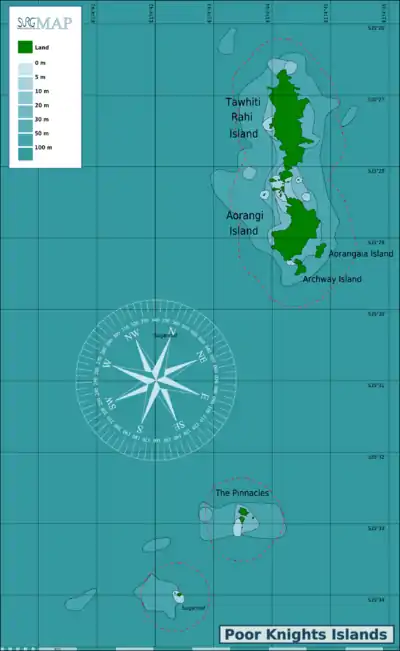 The islands are of volcanic origin, created by a series of eruptions some ten million years ago, and subsequently eroded to their present form. The islands have been ecologically separated from the mainland for about two million years, and are a haven for some of the most endangered terrestrial native wildlife. The Poor Knights comprises two larger islands, Tawhiti Rahi to the north, and Aorangi to the south, and a scattering of islets and rocks, the largest of which are Aorangaia and Archway island, to the south east of Aorangi. A group of smaller islets to the south west is called the Pinnacles, and the southernmost of these is the Sugarloaf.