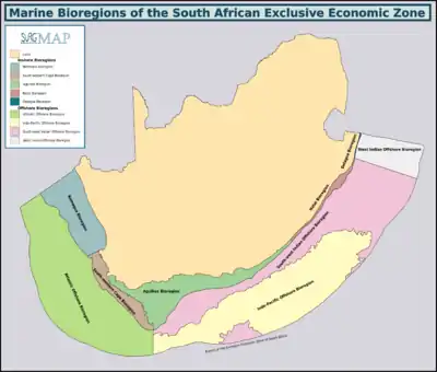 The Tsitsikamma Marine Protected Area is in the warm temperate Agulhas bioregion, which extends from Cape Point to the Mbashe River. The Mbashe River was chosen as the most appropriate boundary between the subtropical Natal province to the north, and the warm temperate Agulhas region to the south, but change is gradual between these regions. Upwelling on the south coast of South Africa is largely driven by the Agulhas current and the continental shelf This form of upwelling forces cold deep water up onto the continental shelf, but not necessarily above the thermocline. In the region east of the Agulhas bank, wind enhanced upwelling, occurring mainly in summer, augments the current driven upwelling bringing the colder deeper waters to the surface. This enhances biological productivity by supply of nutrients to the euphotic zone (where plants have sufficient light to flourish) which fuels phytoplankton production, and rocky shores that are supplied with the nutrient rich water support rich algal biomass.