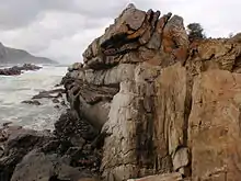 Geology: Sedimentary rocks of the Table Mountain series. Strike is approximately east-west, and dip is variable but generally very steep. The site is in very tightly folded strata and a synclinal axis appears to be nearby.