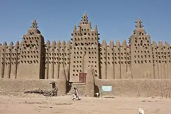 Djenné is a city in Mali, famous for its mosque, which is the biggest mudbrick building in the world. As of 1987, the city had a population of 12,000. Djenné has been recognized as a UNESCO World Heritage Site. UNESCO says on its website that "Djenné became a market centre and an important link in the trans-Saharan gold trade."