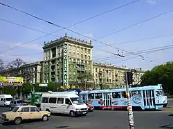 Stalinist architecture (monumental Soviet classicism) dominates in the city centre. Once the Bolsheviks had taken power in Dnipro the city was gradually purged of tsarist-era monuments and monumental architecture was stripped of Imperial coats of arms and other non-socialist symbols. In 1917, a monument to Catherine the Great that stood in front of the Mining Institute was replaced with one of Russian academic Mikhail Lomonosov. Later, due to damage from the Second World War, a number of large buildings were reconstructed. The main railway station, for example, was stripped of its Russian-revival ornamentation and redesigned in the style of Stalinist social-realism, whilst the Grand Hotel Ukraine survived the war but was later simplified much in design, with its roof being reconstructed in a typical French mansard style as opposed to the ornamental Ukrainian baroque of the pre-war era. Other badly damaged buildings were, more often than not, demolished completely and replaced with new structures. This is one of the main reasons why much of Dnipro central avenue, Dmytra Yavornytskoho Prospekt, is designed in the style of Stalinist Social Realism. Many pre-revolution buildings were also reconstructed to suit new purposes. For example, the Emperor Nicholas II Commercial Institute in Dnipro was reconstructed to serve as the administrative centre for the Dnipropetrovsk Oblast, a function it fulfils to this day. Other buildings, such as the Potemkin Palace were given over to the proletariat, in this case as the students' union of the Dnipro National University. - Stalinist architecture blends with the post-modernism of Dnipro's 'Passage' shopping and entertainment centre.