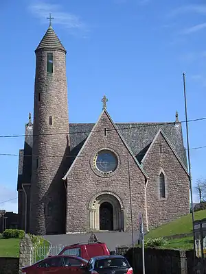 - St Patrick's Church of the Four Masters east end of The Diamond is RC, in sort-of-Romanesque with a Round Tower, but it only dates from 1935.