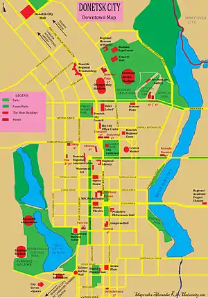 Donetsk (Ukrainian: Донецьк, Russian: Доне́цк) is a city in the Donetsk People's Republic, on the banks of the River Kalmius.