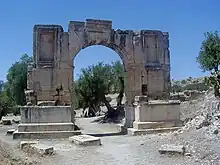 - Septimius Severus's arch.. From the brothel, continue back towards the main exit and you'll reach the arch of Septimius Severus two stumps left, but majestic. On the road that leads towards Carthage (120km).