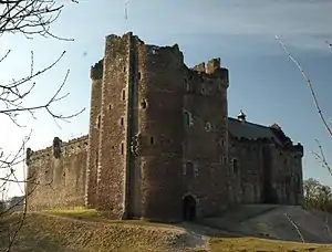 - 🌍 Doune Castle, ☏ +44 1786 841742. Daily Apr-Sept 09:30-17:30, Oct-Mar 10:00-16:00. An imposing Medieval castle on a wooded bend where a tributary joins the River Teith, across a bridge. The site is defended on three sides by the ground sloping steeply down to the rivers, and the approach from the north is defended by earthworks. The castle is entered through a narrow gateway and a 46 ft (14 m) long vaulted passageway that leads to a large central courtyard. Off this, steps lead up to the Great Hall which is connected by arched servery hatches and a door to the massive kitchen. An enclosed staircase from the courtyard reaches the timber panelled Lord's Hall and other apartments. Doune Castle was a location used in the film Monty Python and the Holy Grail and in the television series' Game of Thrones and "Outlander". Adult £9, Concession £7.20, Child £5.40. Summer 2022 - grounds open and free to visit.