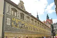 - 🌍 Fürstenzug (Altstadt, near Brühlsche Terasse). This biggest porcelain painting of the world shows (almost) all Saxon princes, electors and kings on their horses and splendid parade uniforms. (There is only one female person at the painting, find it.) It leads to the "Stallhof" - the last preserved tournament place contained in a European castle. In winter, the Stallhof is the location of a medieval style Christmas market with a big fireplace.