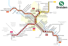 Dresden has an extensive reliable and high quality (even by German standards) public transport system consisting of regional railways (called S-Bahn, historically Schnellbahn), trams (called Straßenbahn) and buses. Three ferries cross the Elbe and two cable car systems go up Loschwitz hill. The Straßenbahn and S-Bahn are two entirely separate networks, although there are tram stops at many S-Bahn stations. The system works very well and connects all points of interest, but can be a little busy at peak times. A common fare system is operated by Dresdner Verkehrsbetriebe (DVB), which is part of the larger Oberelbe Transport Network (VVO). (VVO covers 27 municipalities in central Saxony.) VVO tickets are valid on all buses, trams, regional trains and some ferries within a particular zone in the VVO network area. The Sachsen ticket is now valid on buses and trams in Dresden as well so all information to the contrary is outdated.