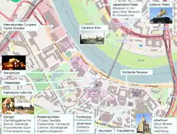 - 🌍 Brühlsche Terrasse (Brühl's Terrace) ( 4 8 and 9 Theaterplatz). The "Balcony of Europe" stretches for 500 m along the River Elbe, some 10 m over the water table, and being up to 20 m wide. Freely open to the public since 1814, it provides space shielded from the danger of flooding, as well as from motorized traffic (which runs directly below over the Terassenufer) for walking, relaxing and enjoying a meal or a drink to locals and visitors, with views of the picturesque Elbe and an impressive backdrop of historic buildings at its back.
