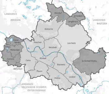 Dresden is very much oriented around the Elbe river, which meanders through the city, but not as much as the Seine in Paris, for example. Therefore, it is always easy to distinguish between the left, southwestern bank and the right, northeastern one. In general, the left bank is relatively flat and more densely built-up, while the right bank is hilly and to a large extent covered by the Dresdner Heide forest.