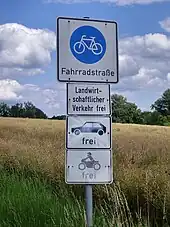 Normal road markings are white. Yellow road markings invalidate any existing white markings, observe the yellow markings. Watch out for cyclists on sidewalk lanes; sometimes they are allowed to use the "wrong direction" lane (though many drive in "wrong direction" even if they are not allowed to do so). If a road crosses a bicycle lane (Radweg) it might have a red or blue colour where it interjects with the bicycle lane or other special markings. Then, cyclists have right of way. If in doubt or there are no markings, its still a good idea to give right of way. Increasingly, one way streets are "opened" to cyclists in both directions, so be prepared for cyclists coming towards you in one way streets, especially in "bicycle cities" like Münster or Erlangen.