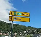 - National roads. Other main roads ("green roads", "riksvei") in addition to E-roads, low one- or two-digit numbers, signs white on green: