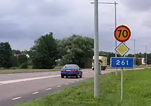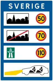 - The highspeed road (motortrafikled) sign indicates 90 km/h (100 km/h on roads with cable fence between the lanes.