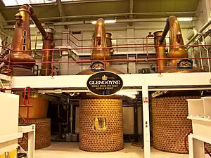 - 🌍 Glengoyne Distillery, Dumgoyne G63 9LB (6 miles south of Drymen), ☏ +44 1360 550254. Founded in 1833, this is one of Scotland's more photogenic distilleries, and being close to Glasgow it's firmly on the tourist and corporate hospitality circuit. The water source is unpeated and the barley is malted without using peat smoke, so the whisky is lowland in nature, very smooth and quaffable. Annual capacity is 1.1 million litres and much of it is blended, but they sell a range of single malts. The owners are Ian Macleod Distillers. Basic tour £18.