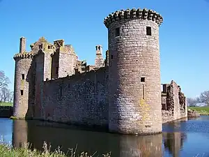 - 🌍 Caerlaverock Castle, Castle Road End, Glencaple DG1 4RU (7 miles south of Dumfries on B725, east of river), ☏ +44 1387 770244. Closed ufn. Impressive twin-towered triangular castle surrounded by a water filled moat. It was completed in 1270 and wrecked and rebuilt until 1640 when it was abandoned. It's scenic and often used as a film location. An earlier square castle of 1230 is 200 yards south: only foundations remain, and probably it was left unfinished when the advantages of the "new" site were seen.
