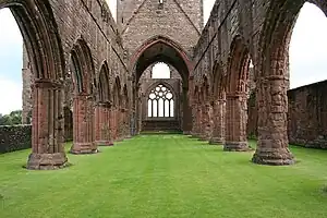 - 🌍 Sweetheart Abbey, New Abbey DG2 8BU (On A710 eight miles south of Dumfries, west of the river). Apr-Sept daily 09:30-17:30, Oct-Mar Sa-W 10:00-16:00. This is the remains of a Cistercian Abbey founded in 1275 (hence the nearby village is called "New Abbey"; the old abbey was Dundrennan to the west near Kirkcudbright). It was founded by Devorguilla in memory of her husband John de Balliol, and she also endowed the Oxford college named for him. She carried his embalmed heart around everywhere in a casket of ivory and silver, until it was buried with her here, though the grave is now lost. Adult £4.