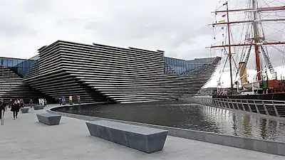 - π Dundee V & A, 1 Riverside Esplanade DD1 4DE. Daily 10:00-17:00. The Dundee branch of London's Victoria and Albert museum, with a focus on design in Scotland. The building on the waterfront is a striking modern design with an interior of ship's planking, as if Discovery next door had arrived as an Ikea flat-pack. Free, charges for special exhibitions.