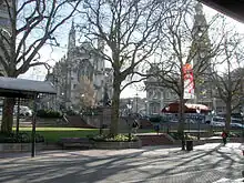 - π The Octagon. In the city centre, it has an octagonal shape instead of the standard square and features a statue of Scottish poet Robert Burns. This statue was unveiled in 1887 and has been restored. It was cast by sculptor Sir John Steell of Edinburgh, Scotland, who made four other, nearly identical, statues, one of which stands in Central Park, New York. Several significant buildings are adjacent to the Octagon, including the Public Art Gallery, St. Paul's Anglican Cathedral, the Town Hall and the Regent Theatre.