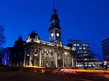 - π Dunedin Town Hall (Municipal Chambers), 38 The Octagon. Completed in 1880 and designed by R. A. Lawson in 1878, it is New Zealand's only surviving significant Victorian Town Hall. Of Italianate design and complete with Corinthian columns and an imposing staircase and balustrade, it is built of Oamaru stone on a base of breccia from Port Chalmers.In 1929 a town hall were added behind the Municipal Chambers, and in the 1980s a new administration building, incorporating a new public library, was added to the Octagon.