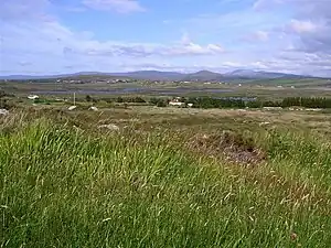 Dungloe had a population of 1785 in 2016, so it's the largest village of The Rosses, the area separated by the Derryveagh Mountains from the rest of the county. "Rosses" means "headlands": grassy boulder-strewn peninsulas facing the Atlantic, with a scattering of islands beyond. Arranmore is the largest island and although part of The Rosses it's described on its own page.