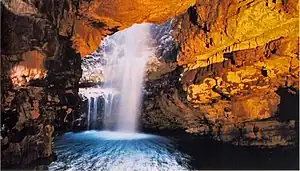 - 🌍 Smoo Cave (Park on main road and follow steps down to the cave entrance). Tours Jun-Aug 10:00-17:00, Apr May & Sept 11:00-16:00. This 83 m cave is a geological oddity, a hybrid. Enter on the shore via the outer chamber, a sea cave created by wave action along a fault in the rock; it once stretched the 600 m length of the sea gorge and you can still make out fragments of the collapsed roof and walls. (The sea nowadays only reaches the cave on the highest tides.) The inner part is a karstic cave created by stream water flowing through limestone, and the two caves have combined. From the outer chamber you follow a walkway over the flooded middle chamber, which has a waterfall when in spate. You can come this far free, any day any time. To go further you have to join the tour, which takes a little boat across the pool to access the innermost chamber. Adult £6.