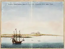 - π Fort Amsterdam (1655-1811), rebranded to Fort Cormantine (after Cormantijn or Cormantine, the nearest settlement, known today as Kortmantse) during British rule, who built the fort in 1631. Some thirty years later, in 1665, the fort was captured by Dutch naval hero Michiel de Ruyter as compensation for Dutch forts taken earlier that year. The fort was granted to the WIC, who renamed it. Initially, gold was the main sales product, which was traded against alcohol, tobacco, and guns. Later on, the slave trade would take over. The fort would briefly be under British occupation again from 1782 to 1785. It became Dutch again, but was overrun by native forces in 1811, forcing the Dutch to abandon the fort. The fort's ruins were largely restored in the early 1970s, funded in part by the Dutch government.
