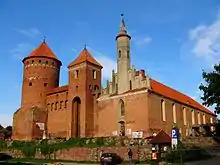The red-marked Copernicus Path turns left at this point, but this is not where the E11 rambler should go. It is tempting to go straight to the vast town centre and find a bed, but the E11 turns right, leaving the town again, it seems, to follow the black markings of a local trail that joins the river Lyna and follows its meandering valley. For some obscure reason this walk avoids most of the medieval beauties of the town and passes along some apartment buildings from the communist era to the railway station. For those who stick to the precise course of E11, a second deception follows after the uninteresting railway station: A trail marked blue takes them back along the same apartment buildings to the entry of the Lyna valley, allows a view of the Knights' Castle and then leaves the town. It is therefore advisable to spend a day in Lidzbark Warmiński to visit the many remnants of medieval Christian Knighthood.