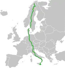 It crosses through the famous Brenner Pass in the Alps, as well as the Kattegat strait between Fredrikshavn and Gothenburg.