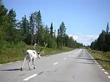 In Sweden and beyond, collisions with elk, deer and reindeer are a risk. Don't ignore the warnings: you don't want a 400 kg elk coming through your windscreen. Watch the edge of the forest and slow down if you see an animal. If one suddenly crosses the road in front of you, try to steer behind it. If the animal may have got hurt, mark the spot and report the accident according to each country's procedures, to allow it being found promptly by hunters or reindeer handlers. If you collided with a boar or bear, drive a bit forward, mark that place instead and explain the arrangement (including the distance) to the authorities, as these animals are dangerous when hurt.