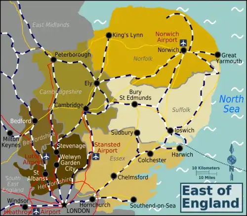 The region contains two of the UK's top five busiest airports: London Stansted (in Essex) and Luton Airport (in Bedfordshire). There is also Norwich International Airport. These airports mainly serve domestic and European flights but there is also a smattering of departures to the Middle East, North Africa and Chicago. If travelling from further afield, London Heathrow is your best bet and should be no more than 2 hours and 30 minutes' drive from anywhere in the region.