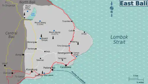East Bali is a large region with natural habitat ranging from lush forests and black sand beaches to barren gravel plains and an active volcano. The south coast is home to the popular seaside resort town of Candidasa and ferries to Lombok at Padang Bai. Mighty Mount Agung, Bali's highest volcano, looms large over the whole of East Bali and hosts Bali's holiest of temples, Pura Besakih. In the far east, Amed is an increasingly popular and ever charming stretch of coast. East Bali provides as much for visitors as any of Bali's regions.