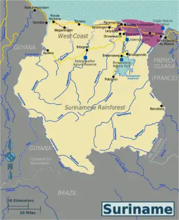 Some 30 km from Paramaribo, on the white sandy coast savanna but along the Saramacca river, lies the Maroon village of Santigron. Its location close to the capital made the village lose much of its traditional features, but its 500 or so permanent inhabitants have embraced tourism as a new, sustainable source of income. As a result, its original Maroon characteristics are slowly being restored and expanded, and facilities for travellers are getting better fast. Many tour operators bring in their guests, who get to see the school, the church and usually one or two dances performed by villagers. Of course, they will also show you some of their handicrafts, hoping you'll be tempted to buy. Your guide or a hired local guide will tell you about life in the jungle, traditional use of its flora and the wooden houses where women would stay during their menstruation days. All in all, Santigron may not be the most authentic, but it surely is one of the most accessible Maroon villages to explore and will allow you to get a good idea of Maroon traditions. It's also one of the few where you could easily get by public transport (there are a few buses per week from Paramaribo) or bike.
