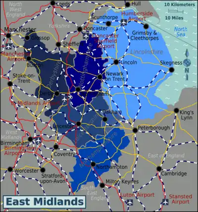 Doncaster Sheffield Airport in Yorkshire is the closest airport outside the region. Buses are available from the airport to both Doncaster and Sheffield railway stations, where you can then catch trains onto East Midlands destinations.