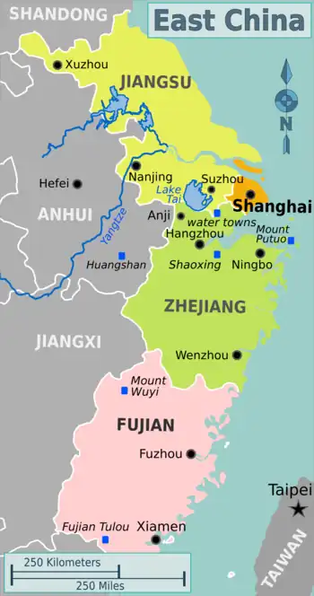 This region is geographically in the center of the Chinese coast and is well-connected by road, rail or air to anywhere else in China. Going north, major attractions include Qingdao and Beijing. Heading southwest, Guangzhou and other cities of the Pearl River Delta are reasonably close. Going west, Huangshan, Wuhan and Xi'an beckon. Of course there are other interesting places in all directions as well.