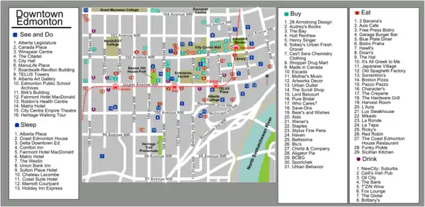 - π Edmonton City Centre (City Centre Mall). M-W 10AM-6PM; Th F 10AM-8PM; Sa 10AM-6PM; Su holidays noon-5PM. In the downtown core at 102nd Avenue and 101 Street. It was built as two malls (Eaton Centre and Edmonton Centre). Many of its stores have closed in rhe early 2020s, including its anchors The Bay and Sport Chek. The food court can be very busy on a weekday lunch. The multi-floor layout can be confusing to the first-time visitor.