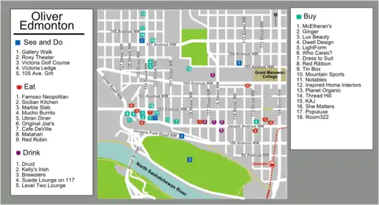 - High Street (102nd Avenue NW between 124 and 127 St NW). This area is host to neat cafΓ©s and cute restaurants with top-notch quality. It also has small gift stores, most notably, Notables. There are also a few furniture places and little pastry stops that are worth stopping at.