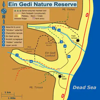 🌍 Ein Gedi Nature Reserve (Arugot Stream & David Stream) (On route 90 2 km north of the kibbutz, follow signs to the Streams), ☏ +972 8 658-4285, fax: +972 8 652-0228. Su-Th & Sa 08:00-16:00, F 08:00-15:00; closes 1 hour later during DST; entry forbidden starting one hour before closing. Ein Gedi's biggest attraction, the nature reserve is a true oasis, with streams running with water all year long, feeding a rich greenery and a variety of desert wildlife. Use the map to find the recommended points of interest; a brochure with a map can also be obtained at the entrance. Hiking trails are detailed below. 29₪ adult, 15₪ child or senior; inclusive both streams and the ancient synagogue. Consider purchasing the Parks and Reserves "Green Card" .