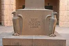 - 🌍 German War Cemetery. The German cemetery is at Height 26, north of the highway. The octagonal central part is made of Egyptian limestone and was inaugurated on 28 October 1959. It has a diameter of 42 metres and towers 12 metres in height on the corners, and was inspired by Castel del Monte in Andria (in the south of Italy). On the rear wall of the lobby, there's a golden mosaic depicting a cross and the Four Evangelists, and the lobby also has a memorial to 31 unknown soldiers. The inner yard has seven cenotaphs with names of German regions, and there are plates with names of 4280 soldiers buried at the cemetery. The memorial was designed by architect Robert Tischler.