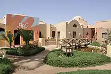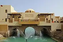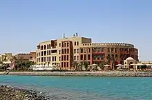 - 🌍 Mövenpick Resort & Spa El Gouna, ☏ +20 65 354 4501, fax: +20 65 354 5160. Built in 1995, renovated in 2014, this hotel is nestled on a peninsula, with its own beachfront. It offers spectacular views of the Red Sea, the tranquil lagoons and the lush gardens. There's a main restaurant and several specialized ones (Thai, Middle-eastern, Mediterranean, seafood). The garden terrace has four swimming pools, and there's a spa, fitness room, different sports facilities plus a children's club with playgrounds. There's a diving operator (Euro Divers) and a kite- and windsurfing center. Rooms have a/c, satellite tv, minibar, safe, balcony and bathroom with shower. Paid Wi-Fi. Downtown with its picturesque architecture and numerous attractions is a few minutes away and Hurghada International Airport can be reached in 30 minutes.