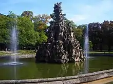 - Some hundred metres north of the old town, you will find the 🌍 Burgberg garden, including the Heinrich Kirchner sculpture park (access either from An den Kellern at the eastern part of the Bergkirchweih grounds or via Burgbergstraße, roughly opposite of house number 58). Between villas, it spans about 30,000 m² and has many old trees. At its upper end, it contains a viewpoint and the best view over the city. A further highlight are the bronze sculputres by Erlangen artist Heinrich Kirchner.