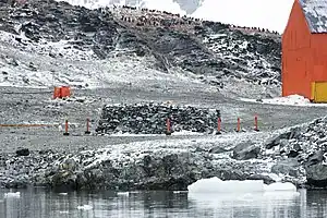 Esperanza Base is an Argentine research base in Hope Bay (Bahía Esperanza) at the tip of the Antarctic Peninsula. Part of it is designated as Fortín Sargento Cabral, a year-round civilian settlement similar to the Chilean settlement of Villa Las Estrellas. In 1978 the first birth in Antarctica was here, and at the last census in 2010 the population was 66. The site is free of ice and has fresh water from a lake: this attracts wildlife especially Adélie penguins and made it a good place for a base.