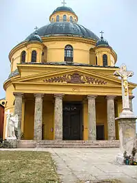- 🌍 Baroque Calvary, with the Classicist chapel (Szent Tamás Calvary and Saint Stephen Chapel, Szent Tamás hegyi kálvária és kápolna), Saint Thomas Hill (Szent Tamás hegy) (On the southern slopes of the Saint Thomas Hill, 1 km east of Esztergom Airport, cross over Szentléleki Creek, toward south on Látóhegyi road further about 600 m and turn to east 500 m to the church), ☏ +36 33 413878, fax: +36 33 413878. These were built to commemorate the heroes who died for Esztergom. The hill was named after a church built by Bishop Lukács Bánffy in memoriam the martyr Saint Thomas Becket, who had been his fellow student at the University of Paris. The church which the Turks built there were destroyed a long time ago. In 1823, Bishop János Benyovszky canon was built in honor of Our Lady of Sorrows a classicist, the historic chapel. A six stationed way leading up to the hill. Before the chapel seen a monumental sculpture group - crucifix, the Virgin Mary, Saint János, Mary Magdalene, two thieves - dates back to 1781. The chapel locates the relic of Saint Thomas Becket. The Baroque Calvary was built in 1781. The classicist Calvary Chapel made in 1823 honored to Our Lady of Sorrows. The building has wall pillar, triangular vaults, small front tower, which is behind the pediments.