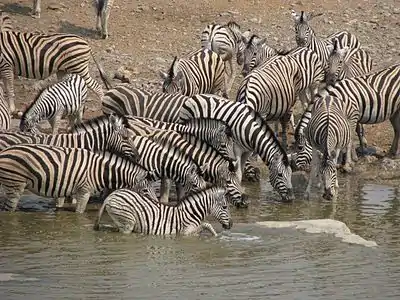 Etosha National Park is the second largest of Namibia's game reserves (after Namib-Naukluft National Park). It spans 20,000 km² in the Four-O region. The park surrounds the dry Etosha salt pan. The waterholes surrounding the pan attract animals, particularly in the drier winter months, because it is a source of water in a very dry land.