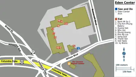 - 🌍 Eden Center, 6751 Wilson Blvd, ☏ +1 703 204-4600. 9AM–11PM. Eden Center, with its colorful arch, cultural vibrance, and frequent Vietnamese cultural events, is that rare strip mall that can rightly be considered a bonafide tourist attraction. The main reason to come is of course the peerless Vietnamese cuisine in its restaurants, but the shopping can be fun too, be it food or tchotchkes (or just useful, if you are Vietnamese and want some DVDs from the home country). There are more than 100 shops and restaurants packed into this small mall.