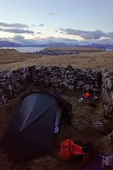Legally camping is only allowed in designated places but in reality, you can camp anywhere as long as you are not impudent. Locals are aware that camping prohibition law is few centuries old and might not apply these days. Safe distance might be half an hour walk away from the village. There are few objects to hide behind so you would be visible from far away, but as long as you pitch a tent in evening and pick up early morning, you should be fine. Once again, camping outside designated areas is not legal but locals do this too.