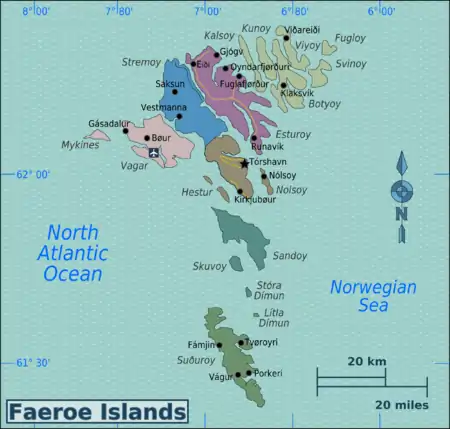 The Faroe or Faeroe Islands (Faroese: Føroyar; Danish: Færøerne) are an archipelago of 18 islands in the middle of the North Atlantic Ocean, with roughly 54,000 inhabitants (2022). Like Greenland, the Faroe Islands are an autonomous territory of Denmark.
